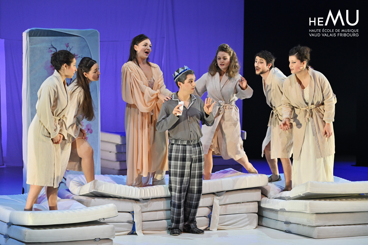 En février et en avril 2024, des étudiant·es de l’HEMU ont participé à la production de l’opérette Les Aventures du roi Pausole du compositeur suisse Arthur Honegger, à l’Opéra de Lausanne et au Théâtre Équilibre de Fribourg, en collaboration avec le NOF (Nouvel Opéra Fribourg). Quatre représentations ont permis à deux distributions d’étudiantes et étudiants de vivre cette expérience d’ores et déjà mémorable, qui a constitué une opportunité de professionnalisation enrichissante.